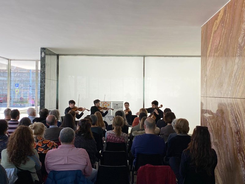 Gil Sisquella i Jaume Angeles als violins, Bernat Santacana a la viola i Iago Domínguez Eiras al violoncel interpretaran tres divertimenti per quartet de corda de Benjamin Britten, tres Fantasies (6, 4, 5) de Henry Purcell i el Quartet de corda nº 1, Op. 7 d’Arnold Schönberg acompanyats amb els comentaris del crític i divulgador musical Toni Colomer.