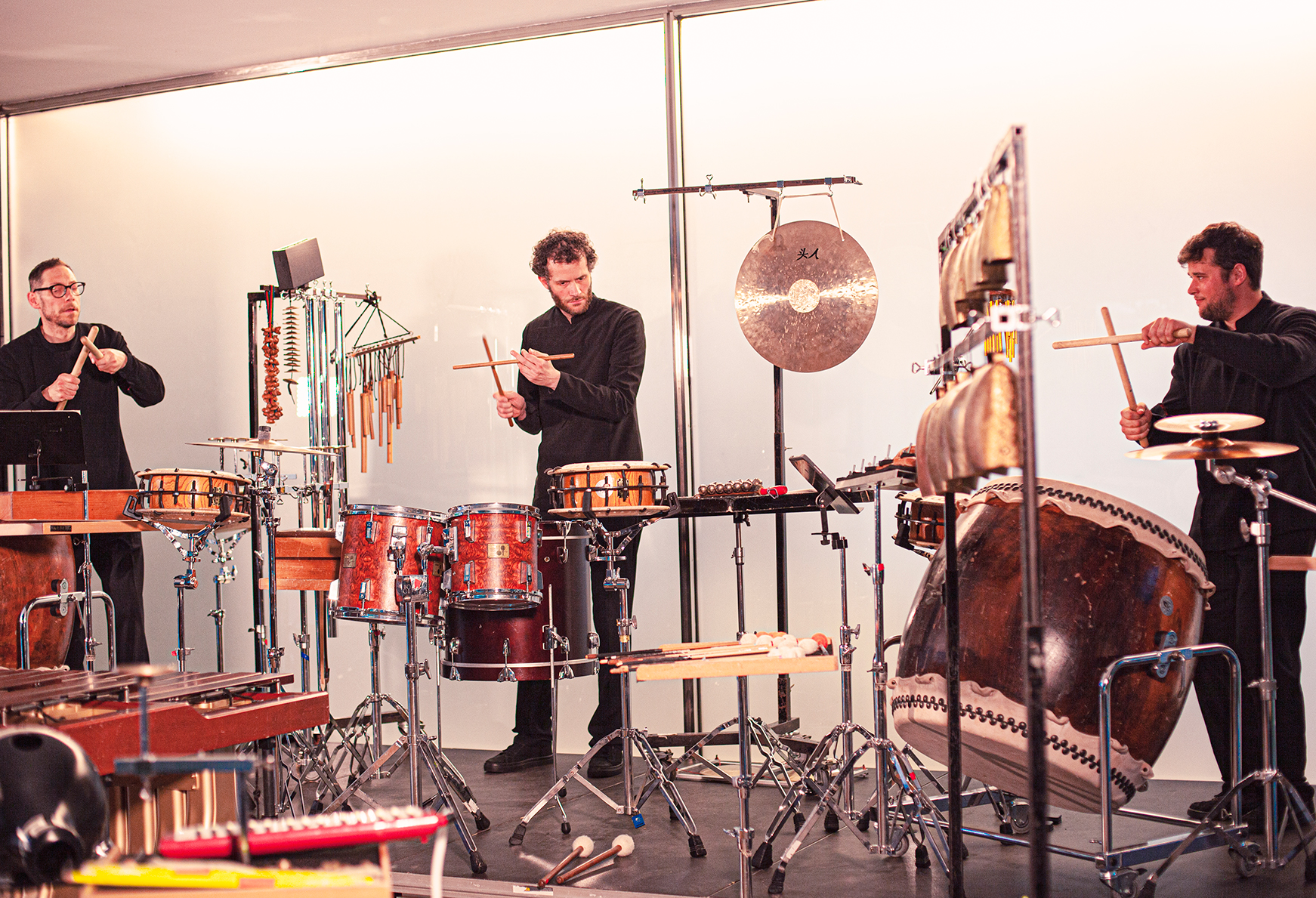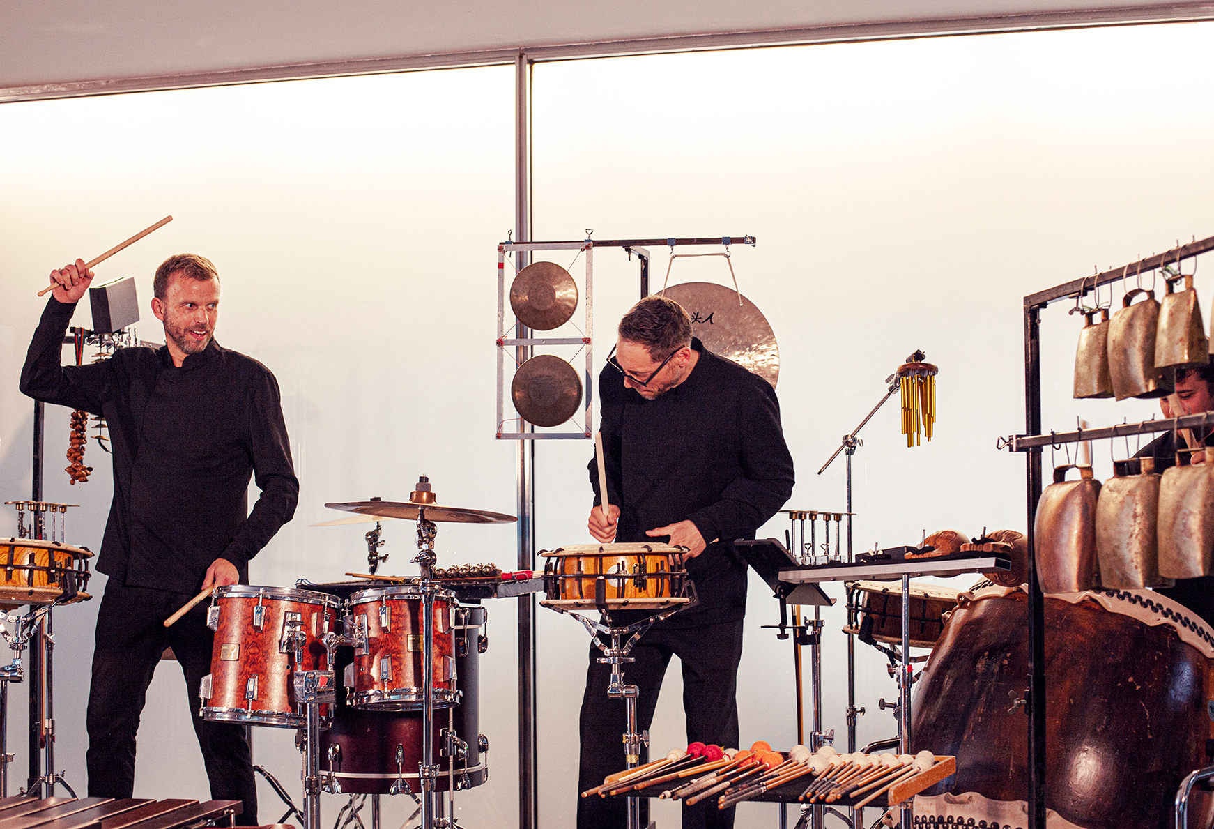Aquests virtuosos de la percussió, amb més de 25 anys de trajectòria internacional en concerts i al món del teatre i del cinema, convertiran el Pavelló Mies van der Rohe en un laboratori sonor, amb els seus múltiples, variadíssims i inesperats instruments que inclouen tambors, marimbes, vibràfons, taikos i gongs així com una col·lecció d’objectes quotidians que no s’utilitzen per les finalitats previstes.