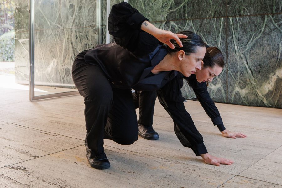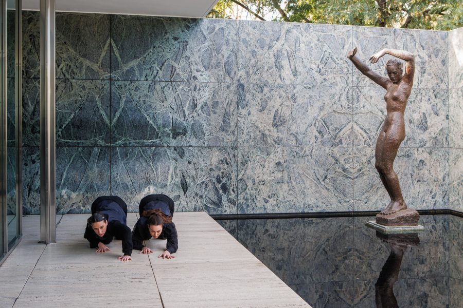 En el marc de l’exposició “Art en Pedra” de La Pedrera es presenta la performance “La Caída o el gran altre: el mur d’ònix daurat” al voltant de la peça d’ònix del Pavelló Mies van der Rohe.