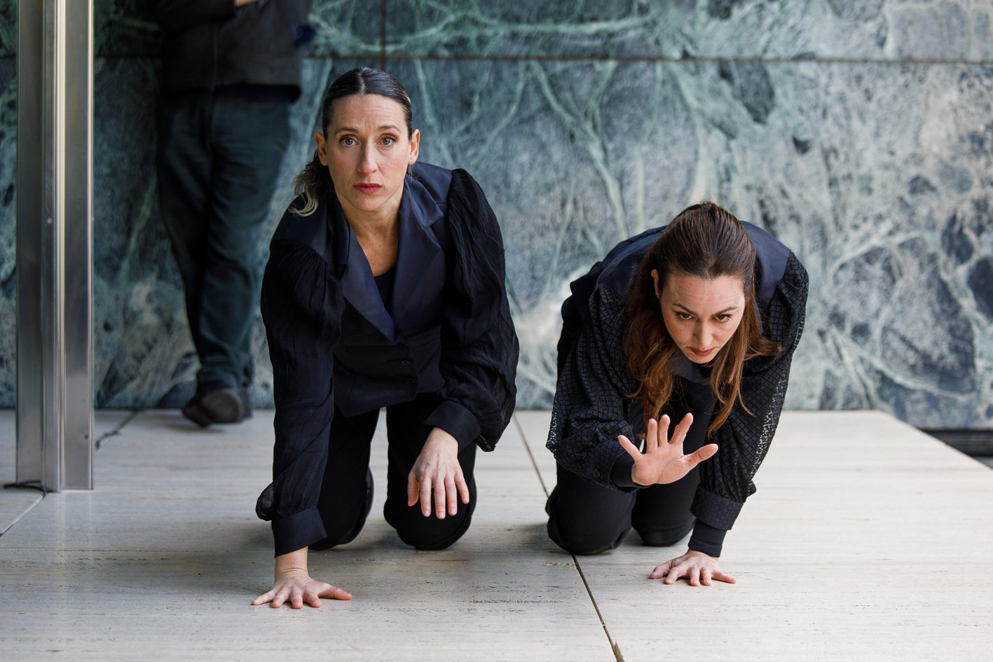 En l’adaptació d’aquesta creació al Pavelló Mies van der Rohe, es planteja la pregunta per la dualitat a partir de la relació dels cossos entre si i amb el mur d’ònix daurat que presideix la sala noble. Aquesta pedra semipreciosa, així com els reflexos i transparències que trobem al seu voltant, és aquell gran altre, insondable en la seva bellesa natural i artificial alhora. Què diu de nosaltres com a humans la peça d’ònix daurat?